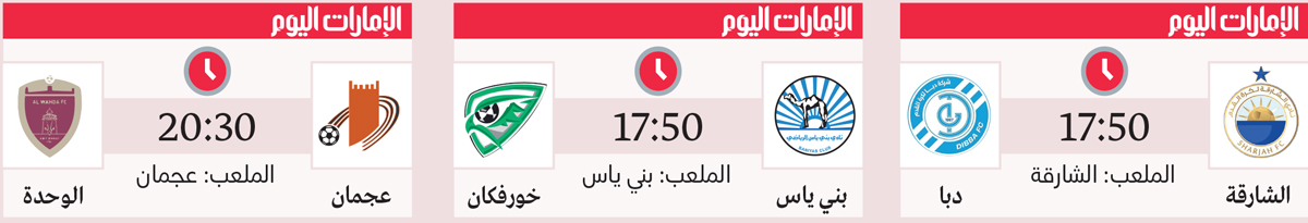 ويخوض الشارقة على ملعبه في الساعة 17:50 مساءً اختباراً حقيقياً أمام ضيفه دبا، وذلك بعد انتصاره في لقاء الذهاب بهدف نظيف منحه أفضلية ضئيلة، وهو ما يجعل من اللقاء مهمة غير سهلة أمام فريق دبا الساعي لتعويض خسارته ومحاولة استثمار الضغط الواقع على أصحاب الأرض، خصوصاً أن النتيجة تبقى قابلة للتغيير في أي لحظة.