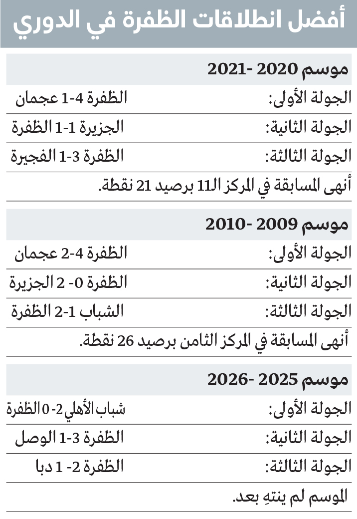 حقق الظفرة ثاني أفضل بداية له في تاريخ مشاركاته بدوري أدنوك للمحترفين لكرة القدم، بعد أن جمع ست نقاط من أول ثلاث جولات في الموسم الحالي 2025-2026، وهو الرقم ذاته الذي سجله في نسخة 2009-2010، بينما تبقى أفضل انطلاقة له في موسم 2020-2021 عندما حصد سبع نقاط.