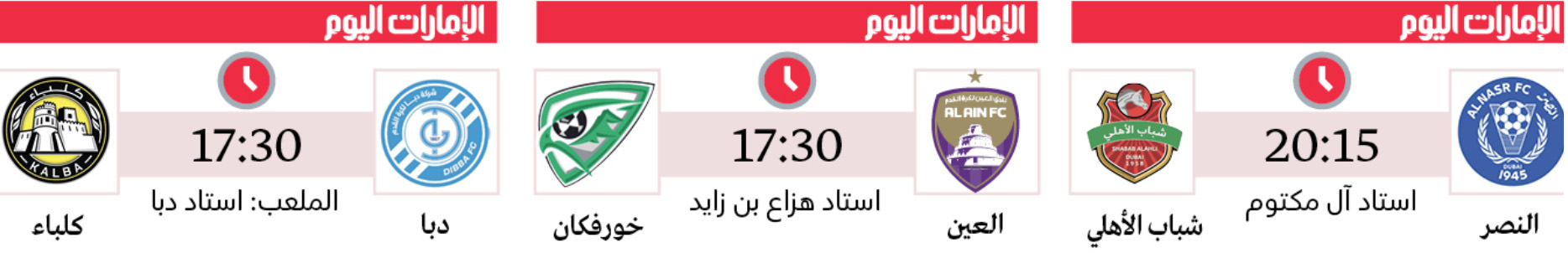 وفي مواجهة أخرى، يرفع العين شعار «الصدارة لا تقبل القسمة» حين يستضيف خورفكان عند الساعة 17:30 مساءً على استاد هزاع بن زايد، ويملك «الزعيم» سبع نقاط في المركز الثاني ولا يرضى بغير الفوز لمواصلة الضغط على القمة، مستنداً إلى واحد من أقوى خطوط الهجوم في الدوري.