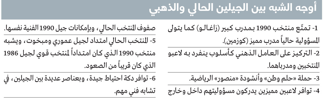 وتابع: «هنالك تشابه كبير بين الجيلين سيساعد المنتخب الحالي بالنجاح في مشواره المقبل، إذ إن منتخب 1990 كان امتداداً لمنتخب تصفيات 1986 الذي كان قريباً من الصعود، قبل أن تذهب البطاقة لمنتخب العراق، بينما المنتخب الحالي امتداد لأكثر من منتخب نجح في الاستحقاقات الماضية، ومنها منتخب عموري وعلي مبخوت بعامل مشترك. وهنالك وجه تشابه آخر، يتمثل بالمستوى الفني العالي للاعبين، والنتائج التي يحققها منتخب كوزمين مقارنة بمنتخب الجيل الذهبي»، مبيناً أن توافر دكة احتياط جيدة، وبعناصر عديدة بين الجيلين، يزيد من التشابه الفني أيضاً.