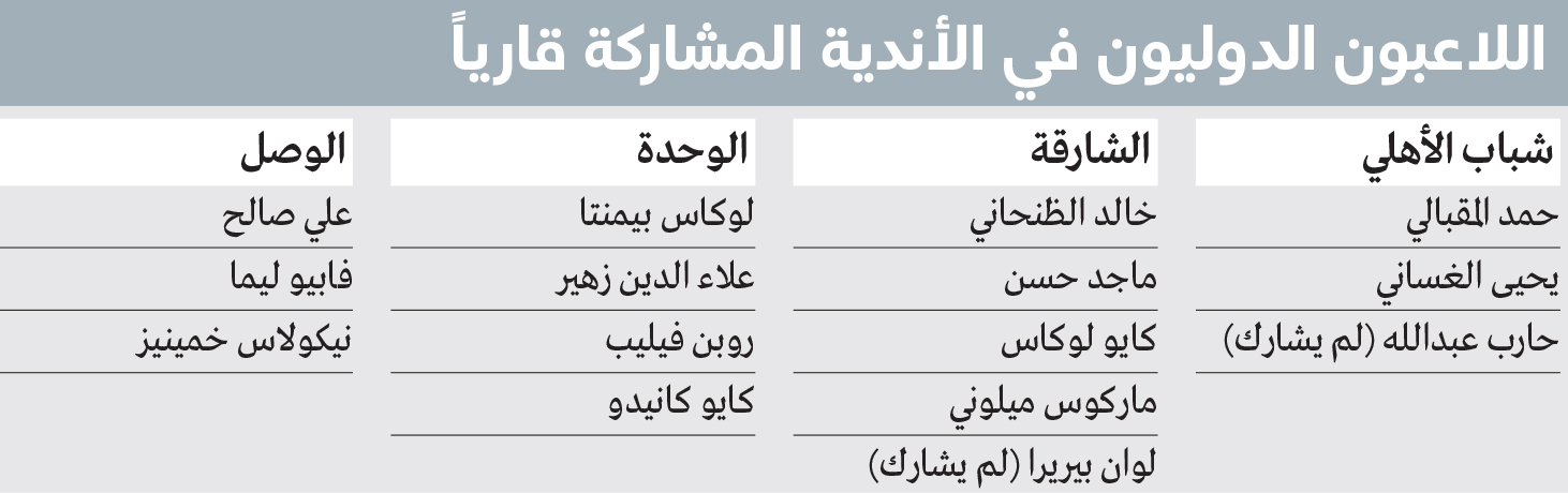 ومن الشارقة، برز خالد الظنحاني وماجد حسن، إلى جانب الثنائي كايو لوكاس وماركوس ميلوني، في حين غاب لوان بيريرا عن المشاركة.
