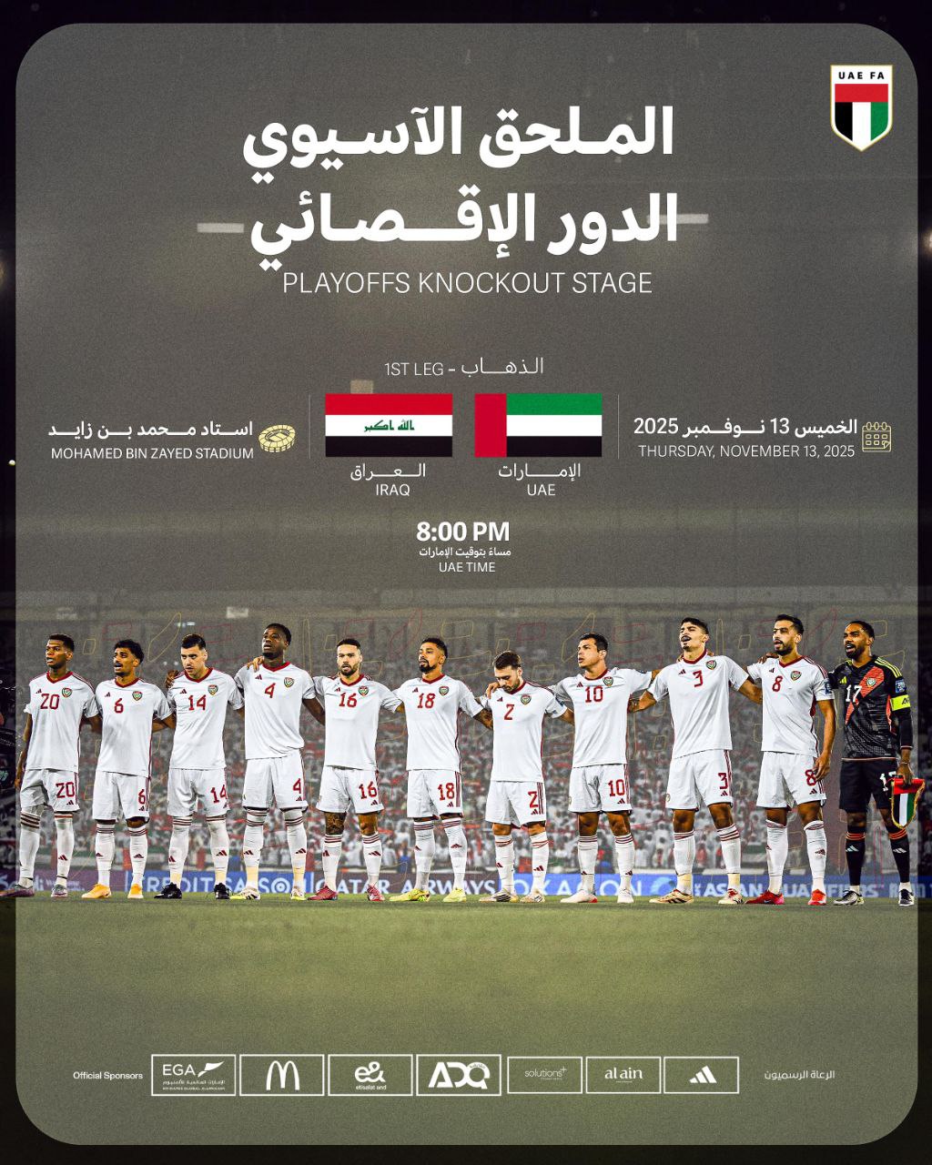 أعلن اتحاد الإمارات لكرة القدم اليوم الثلاثاء أن استاد محمد بن زايد في العاصمة أبوظبي سيستضيف مباراة الذهاب لمنتخبنا الوطني مع نظيره منتخب العراق ضمن الدور الإقصائي المؤهل إلى مونديال 2026.