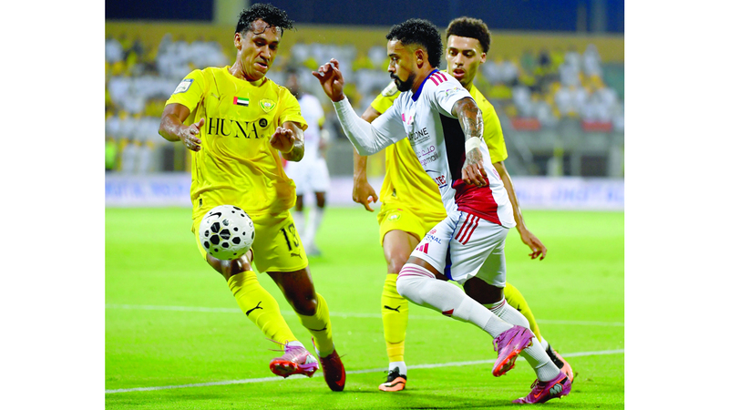 ريناتو تابيا (يسار) يحاول إيقاف كايو لوكاس خلال مباراة للوصل أمام الشارقة. تصوير: إريك أرازاس