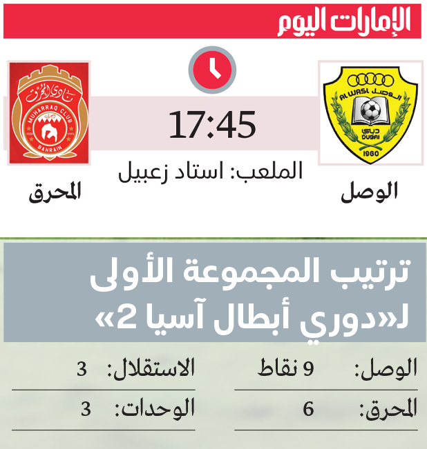 يستهدف الوصل تكرار انتصاره على المحرق البحريني عندما يلتقيان على استاد زعبيل اليوم، في الساعة 17:45، في الجولة الرابعة من مباريات المجموعة الأولى من بطولة «دوري أبطال آسيا 2»، حيث يسعى «الإمبراطور» إلى حسم تأهله مبكراً إلى الدور المقبل، قبل خوض الجولتين الخامسة والسادسة من دور المجموعات أمام الاستقلال الإيراني والوحدات الأردني.