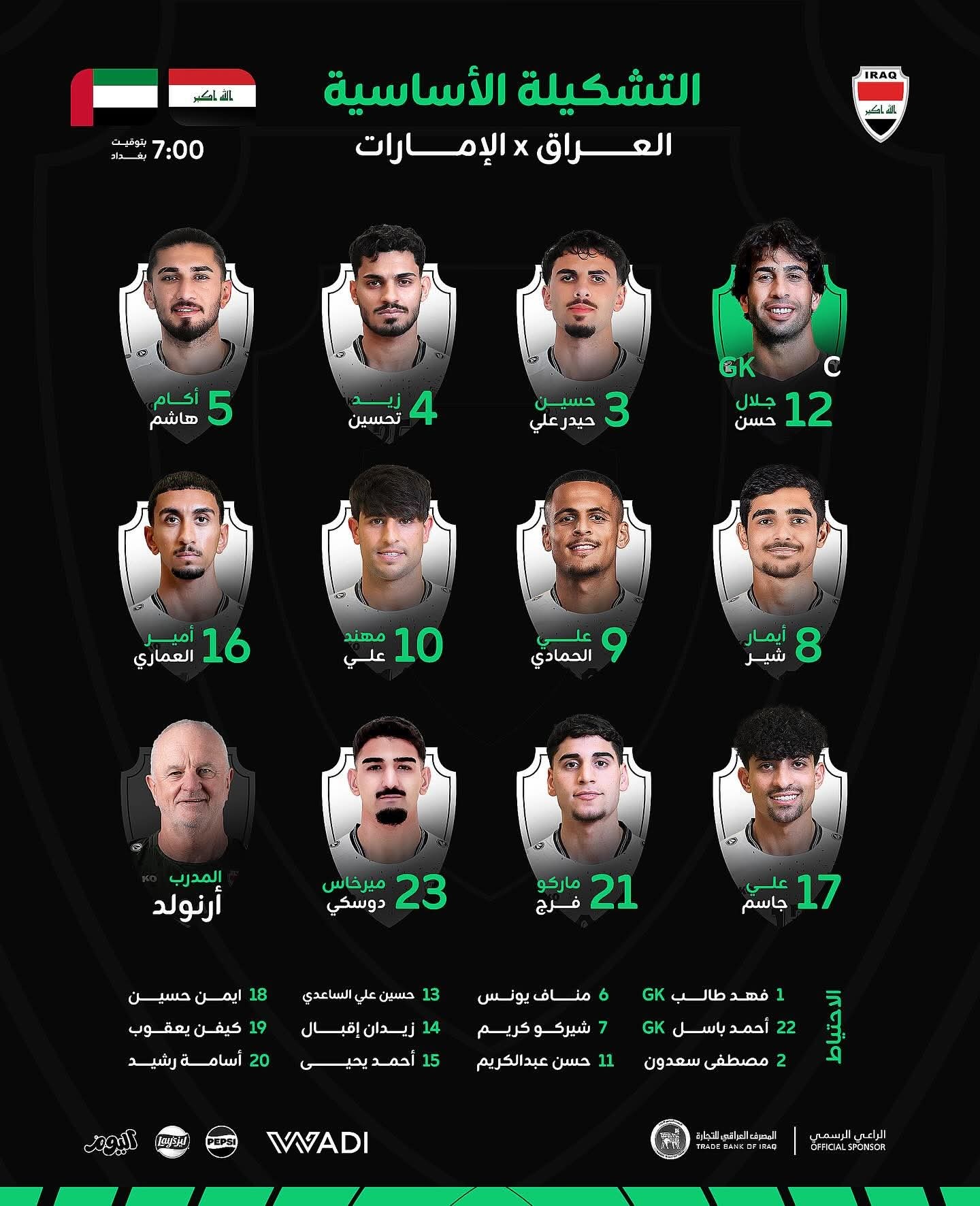 وكشفت التشكيلة الأساسية لمنتخب «أسود الرافدين» أن المدرب الأسترالي غراهام أرنولد يراهن على التنظيم الدفاعي لتفادي الهجمات المتوقعة من «الأبيض» الإماراتي، فيما فضّل إبقاء عدد من اللاعبين ذوي النزعة الهجومية على دكة البدلاء، من بينهم أيمن حسين وزيدان إقبال.