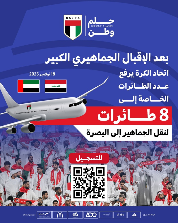 وكان الاتحاد الإماراتي لكرة القدم قد أعلن صباح اليوم السبت توفير 5 طائرات خاصة لجمهور «الأبيض» لمؤازرة المنتخب الوطني الذي سيلعب مع نظيره العراقي في البصرة يوم الثلاثاء المقبل في استاد البصرة الدولي في الملحق الآسيوي المؤهل إلى العالمي المؤهل بدوره إلى نهائيات كأس العالم 2026، قبل ان يلعن اكتمال حجز مقاعد الطائرات الخمس.