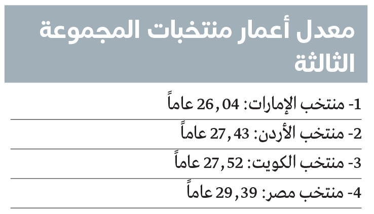 ورصدت «الإمارات اليوم»، معدل الأعمار للقوائم التي تم الكشف عنها من اتحادات الكرة لمنتخبات المجموعة، والمكونة من 23 لاعباً في كل قائمة، وجاء خلالها «الأبيض» بمعدل أعمار لاعبين يبلغ 26.04 عاماً، يليه المنتخب الأردني بمعدل أعمار يبلغ 27.43 عاماً، ثم المنتخب الكويتي 27.52 عاماً، والمنتخب المصري الأعلى من حيث معدل الأعمار والبالغ 29.39 عاماً.