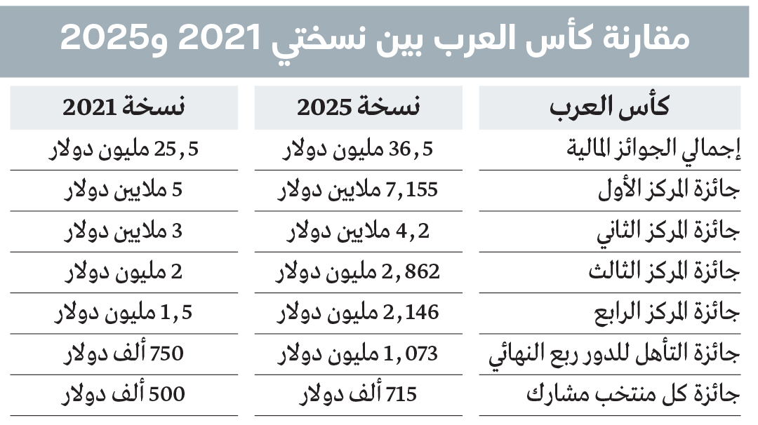 ويحصل كل منتخب مشارك في كأس العرب على مبلغ 715 ألف دولار، مقارنة بـ500 ألف دولار لكل منتخب في أمم إفريقيا، و200 ألف دولار في كأس آسيا.