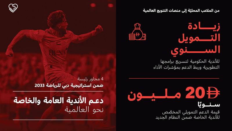 كما تتضمن الخطة تخصيص دعم سنوي للأندية الخاصة يصل إلى 20 مليون درهم، إضافة إلى ميزانية خاصة موجهة للأندية الصغيرة، بما يضمن تطوير المواهب وتعزيز الأثر الاجتماعي للأندية.