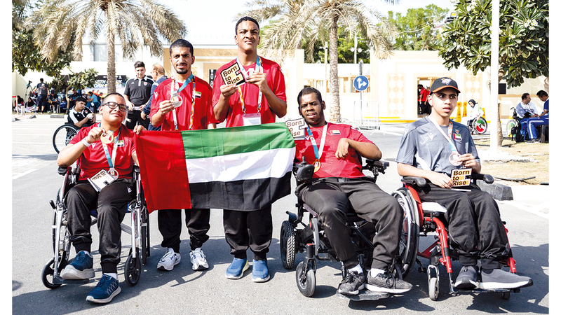 أبطال المنتخب الوطني يرفعون علم الإمارات في ختام دورة الألعاب البارالمبية الآسيوية للشباب في دبي. من المصدر