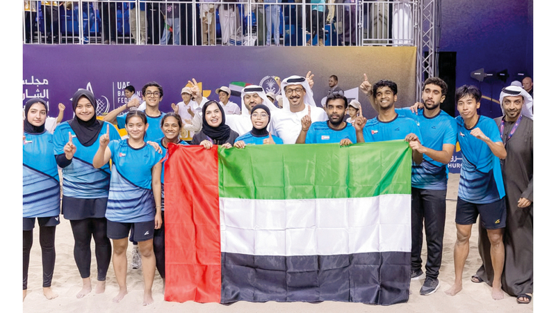 الأبطال يرفعون علم الإمارات احتفالاً بلقب كأس العالم للريشة الطائرة بالهواء الطلق. من المصدر