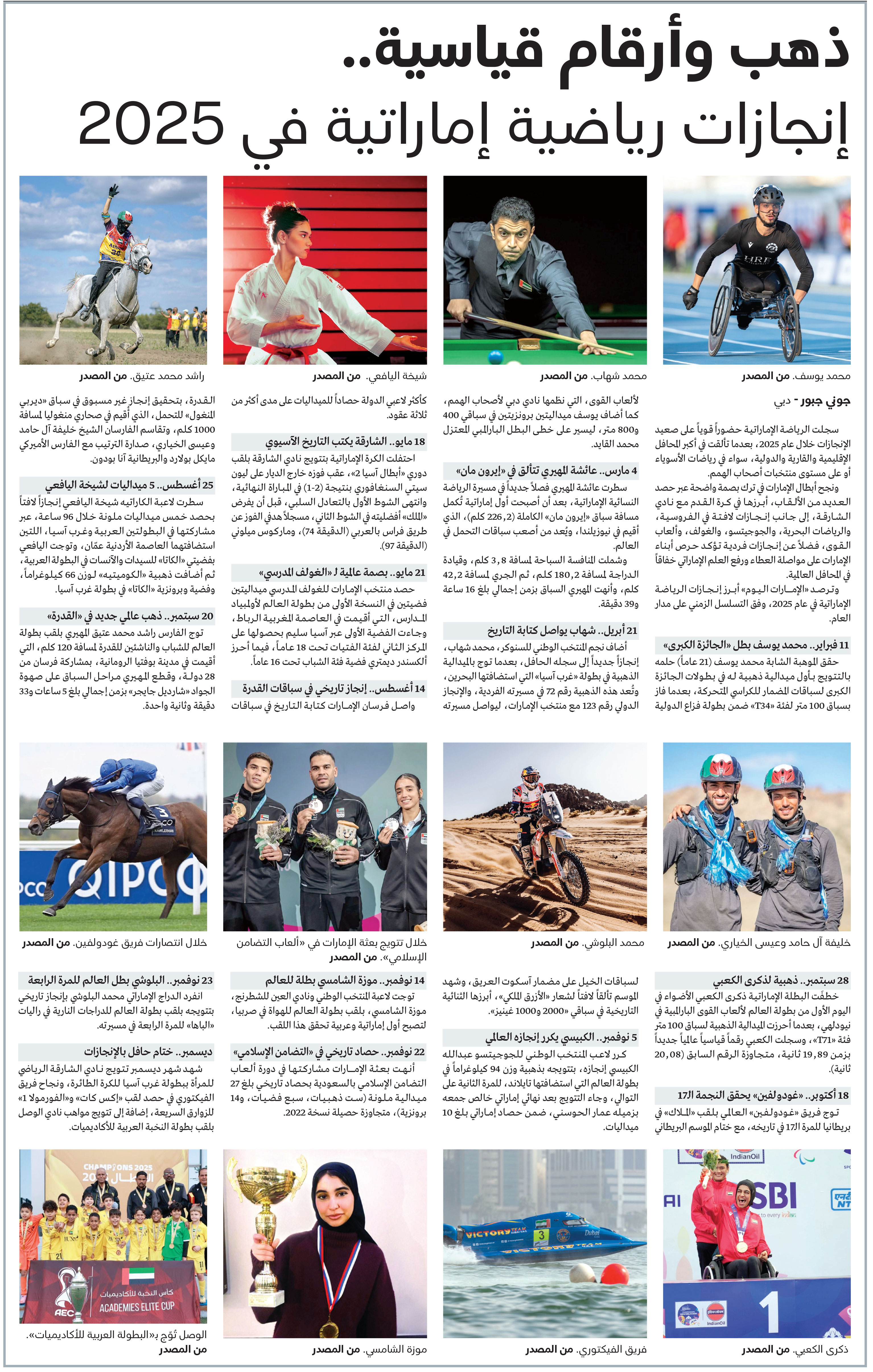 وترصد «الإمارات اليوم» أبرز إنجازات الرياضة الإماراتية في عام 2025، وفق التسلسل الزمني على مدار العام.