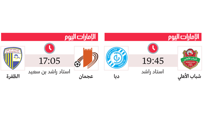 يستضيف استاد راشد بن سعيد، في الساعة 17:05، مواجهة تجمع طرفي المنطقة الدافئة، عجمان صاحب المركز التاسع برصيد 13 نقطة، وضيفه الظفرة الذي يحتل المركز الثامن بـ15 نقطة، في لقاء يسعى فيه الطرفان إلى الظفر بالنقاط الثلاث من أجل البقاء بعيداً عن دائرة الخطر.