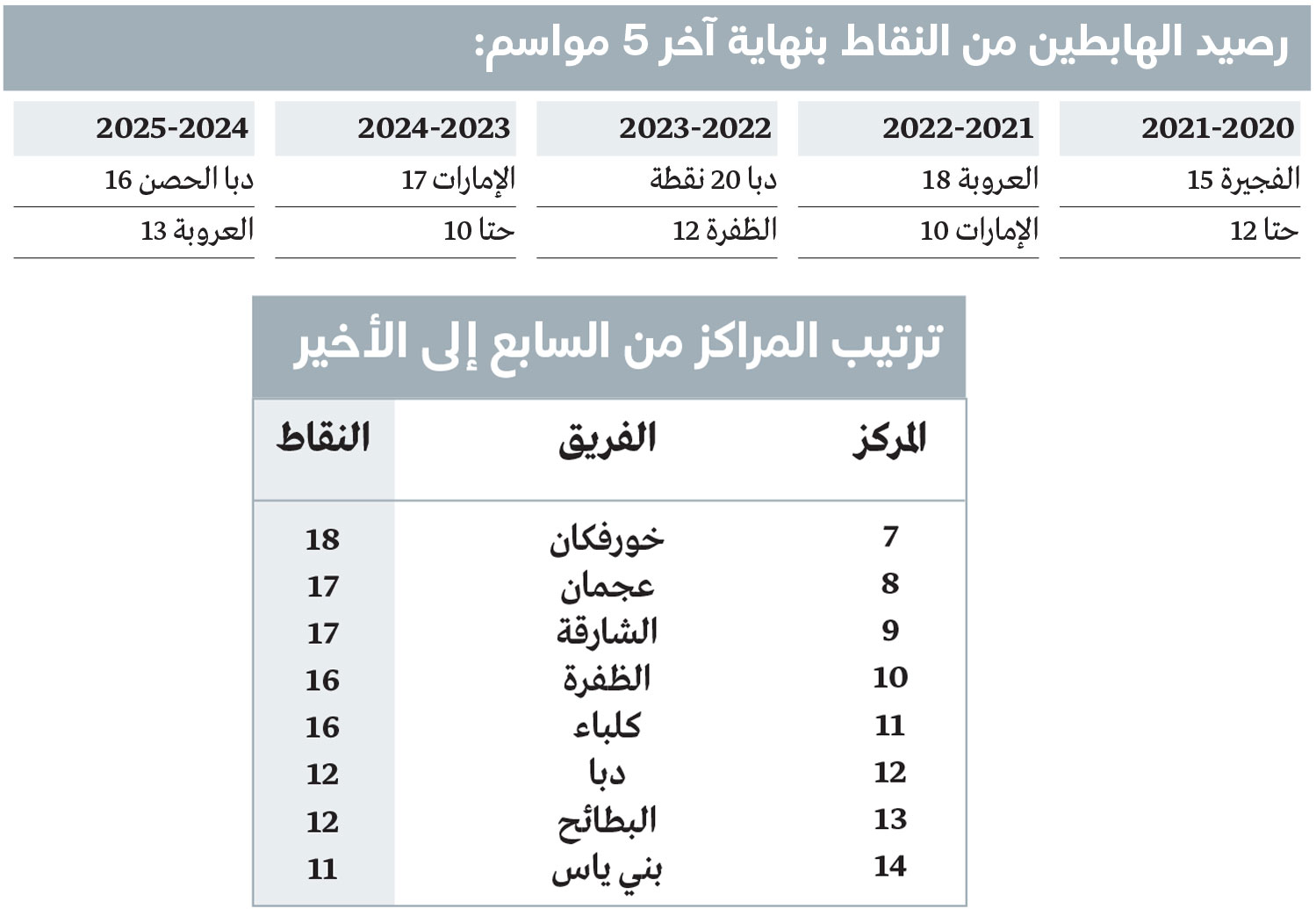 ولا يفصل بين بني ياس، صاحب المركز الأخير برصيد 11 نقطة، وخورفكان، الذي يحتل المركز السابع بـ18 نقطة، سوى سبع نقاط فقط، ما يجعل كل نتيجة في الجولات المقبلة ذات تأثير مباشر في مصير أكثر من نصف أندية الدوري، ويحوّل كل مباراة إلى مواجهة مصيرية.