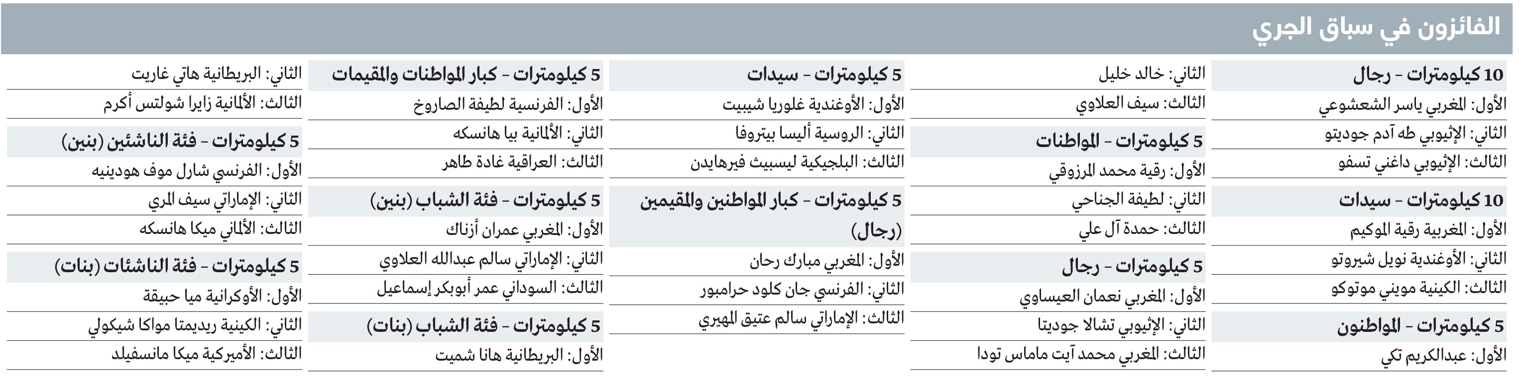 من جهة أخرى، كرمت اللجنة المنظمة لدورة ند الشبا الرياضية الفائزين في سباقي الدراجات الهوائية والجري، إذ توّج الأبطال كل من مدير الدورة حسن المزروعي، وعضو اللجنة المنظمة ومدير إدارة الفعاليات في مجلس دبي الرياضي عيسى شريف، ورئيس اللجنة الفنية للدورة عادل البناي.