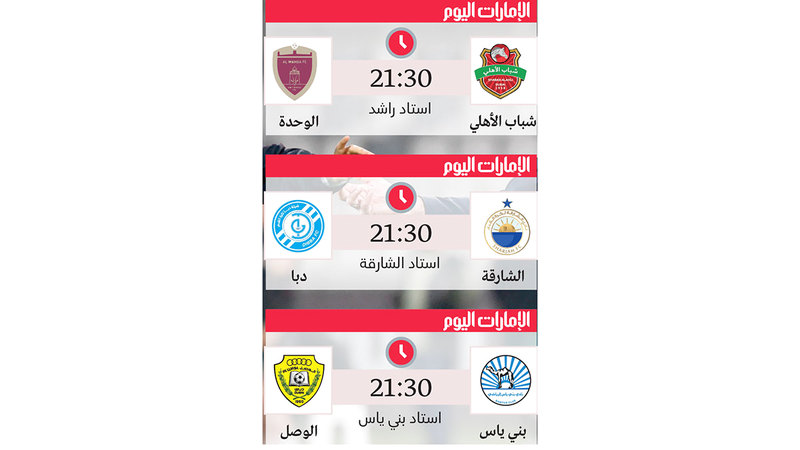 يملك فريق شباب الأهلي فرصة استعادة صدارة ترتيب دوري المحترفين لكرة القدم، وذلك عندما يستقبل في الساعة 9:30 مساء اليوم ضيفه الوحدة على استاد راشد في دبي، ضمن القمة الكروية التي تحمل الرقم الـ34 بين الفريقين، والمؤجلة من الجولة الـ16 للمسابقة، والتي تشهد كذلك مباراتين في التوقيت نفسه بين بني ياس وضيفه الوصل، ولقاء الشارقة أمام دبا.
