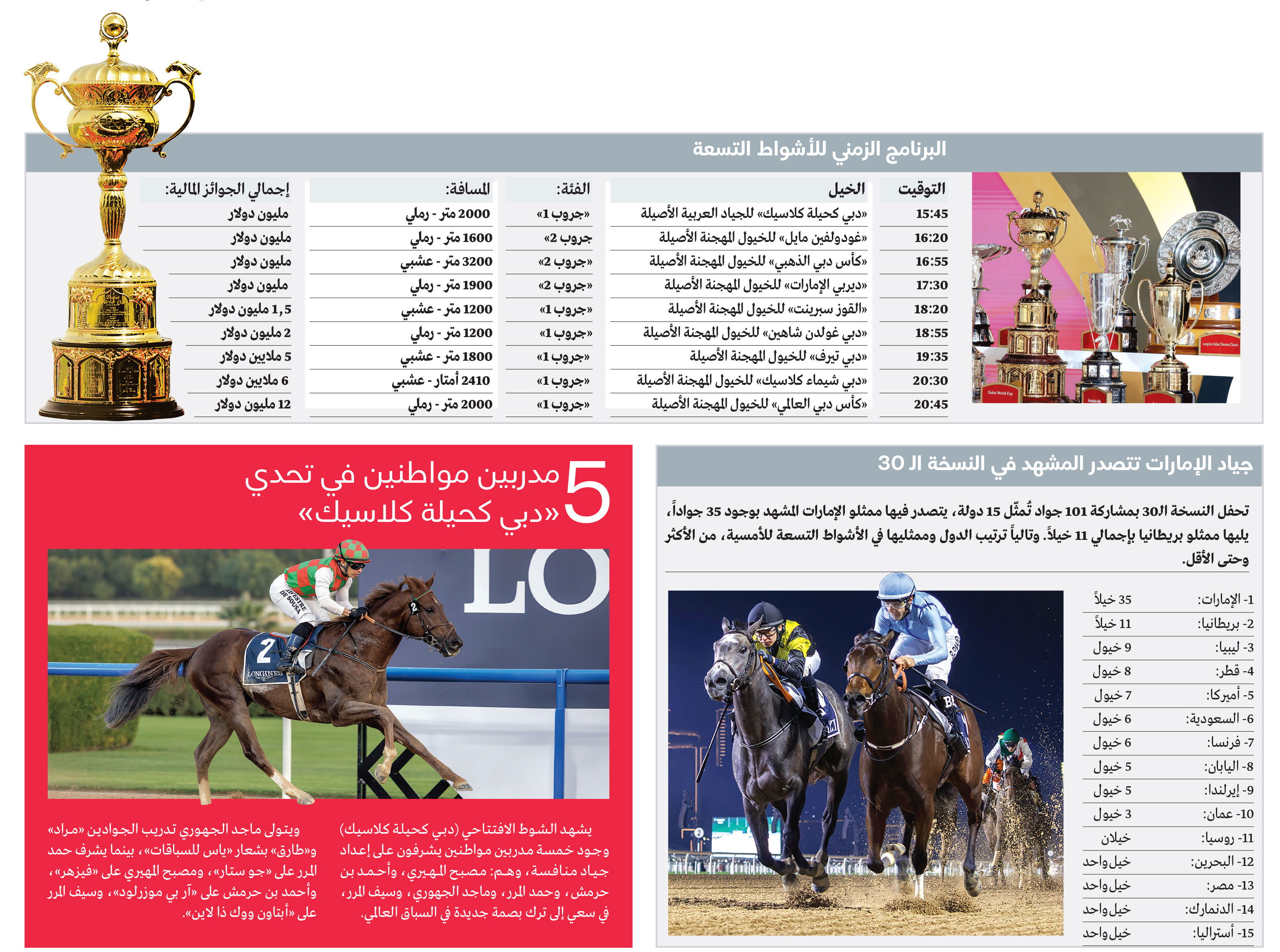 ويُعدّ الحدث من أكثر سباقات الخيل انتشاراً على مستوى العالم، بمشاركة نخبة من الخيول تمثّل نحو 15 دولة، ضمن تسعة أشواط تتصدرها «كأس دبي العالمي» البالغة جوائزه 12 مليون دولار، برعاية طيران الإمارات.