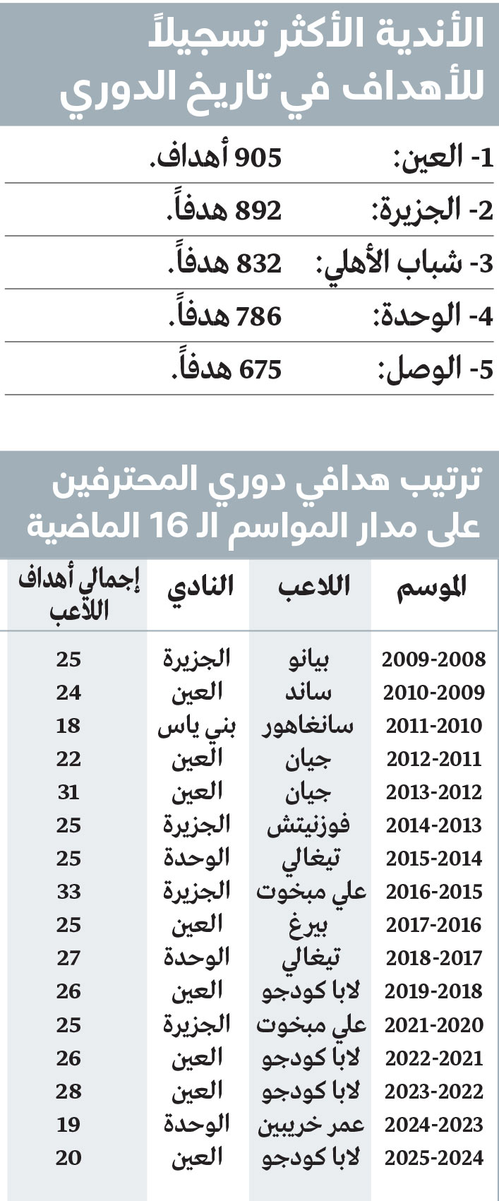العين يواصل تربعه على عرش الأكثر تسجيلاً في الدوري بإجمالي 905 أهداف. تصوير: إريك أرازاس