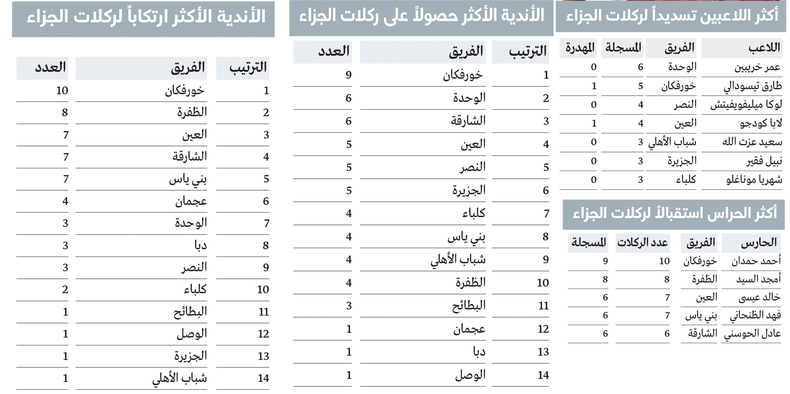 وفي جانب حراسة المرمى، تكشف الأرقام عن معاناة واضحة في التصدي لركلات الجزاء، إذ تبدو نسبة النجاح منخفضة، فقد واجه أحمد حمدان (خورفكان) 10 ركلات استقبلت شباكه تسع منها، يليه أمجد السيد (الظفرة) الذي واجه ثماني ركلات دخلت جميعها مرماه، فيما استقبل كل من خالد عيسى (العين) وفهد الظنحاني (بني ياس) ستة أهداف من أصل سبعة ركلات واجهاها.