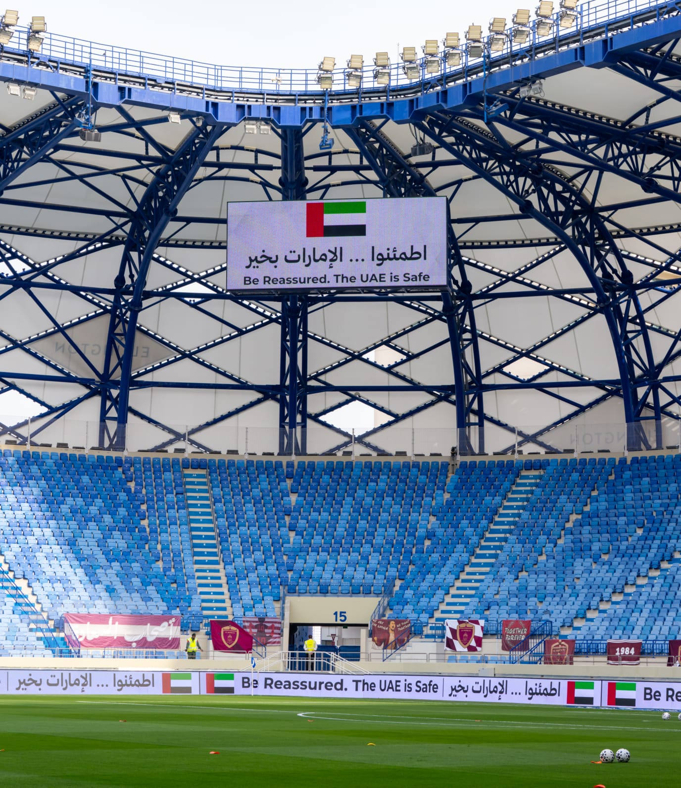 زينت لافتة تحمل عبارة "اطمئنوا الإمارات بخير"، استاد آل مكتوم في دبي الذي يحتضن مباراة النصر والوحدة، ضمن الجولة 21 من دوري المحترفين.