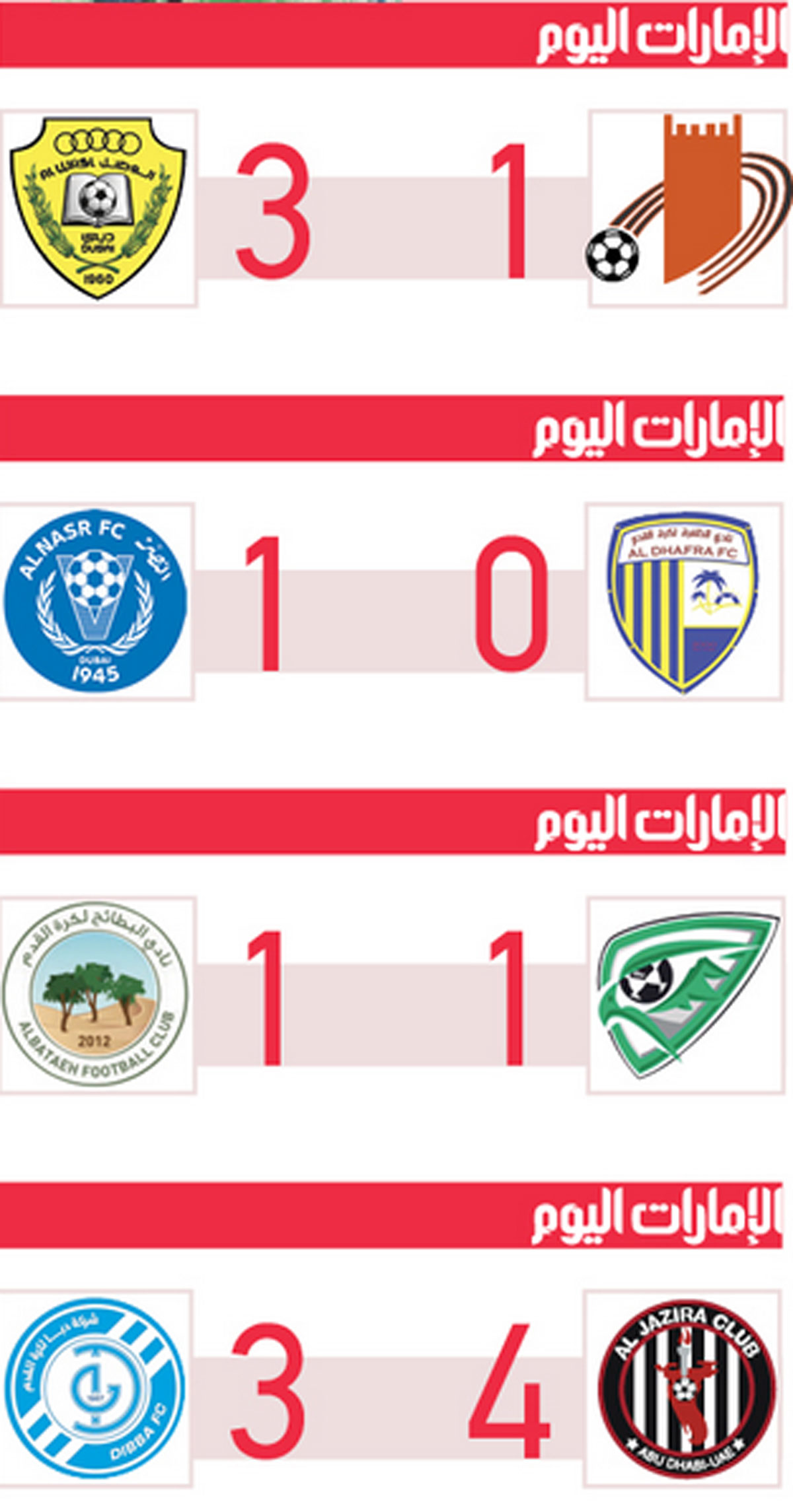 من جانبه ابتعد فريق الجزيرة بالمركز الثالث المؤهل للمشاركات الخارجية، بعدما حقق فوزاً مثيراً على ضيفه دبا بنتيجة 4-3، في المواجهة التي جمعتهما أمس، بحضور نحو 1500 متفرج.