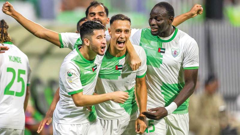 فرحة عارمة للاعبي دبا الحصن بعد الفوز على العربي. تصوير: زيشان أحمد
