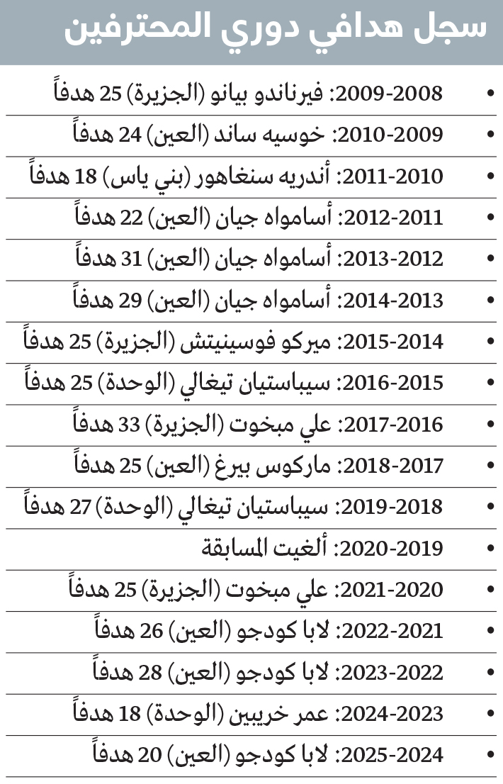 ولا تقتصر قصة هيمنة العين على لقب الهداف على اسم لابا كودجو وحده، بل تمتد إلى تاريخ طويل للزعيم في سباق الهدافين منذ انطلاقة دوري المحترفين موسم 2008-2009.