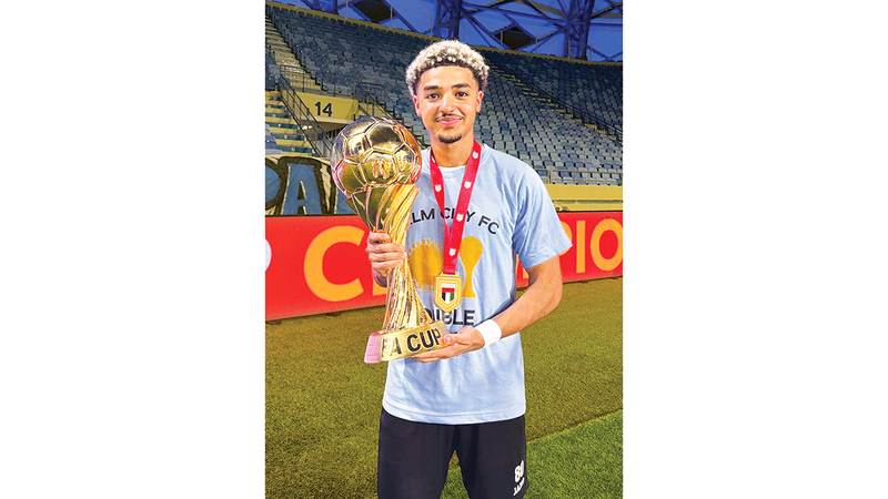 لاعب نادي «بالم 365» أنس أسامة يرفع كأس الاتحاد. من المصدر