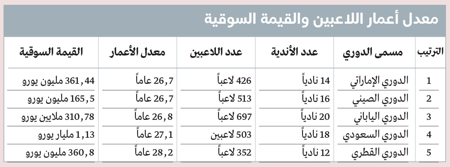 وأظهرت الإحصاءات أن الدوري الإماراتي - الذي يحتل المركز الثاني آسيوياً من حيث القيمة السوقية بإجمالي يبلغ 361.44 مليون يورو (وفق تصنيفات أبريل الجاري) - سجّل أقل معدل أعمار بين هذه الدوريات، بمتوسط 26.7 عاماً للاعبين الـ426 المقيدين في صفوف 14 نادياً بدوري المحترفين.