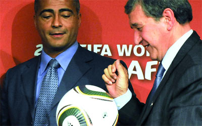 روماريو (يسار) وكارلوس ألبيرتو يتفحصان الكرة المثيرة للجدل. أ.ف.ب