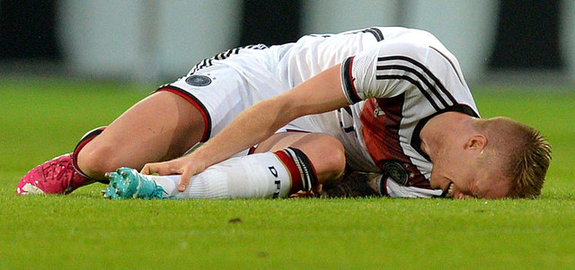 تلقى منتخب ألمانيا لكرة القدم صفعة قوية، لغياب نجمه ماركو ريوس عن نهائيات كأس العالم، التي تنطلق الخميس المقبل في البرازيل بسبب الإصابة، بحسب ما ذكر الاتحاد الألماني للعبة أمس السبت. وتعرض ريوس نجم بوروسيا دورتموند للإصابة في المباراة الودية التي فازت فيها ألمانيا على أرمينيا 6-1 وديا، أول من أمس، حيث نقل على أثرها إلى المستشفى قبل نهاية الشوط الاول، وأكدت الفحوص الطبية إصابته بتمزق جزئي في أربطة الكاحل الايسر.