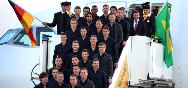 المنتخب الألماني لدى وصوله الأراضي البرازيلية حاملاً أمل جماهيره العريضة. أ.ف.ب