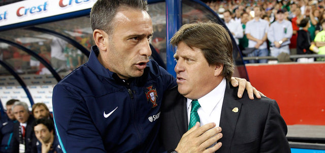 مدرب البرتغال بينتو (يسار) يراهن على اللغة من أجل دعم البرازيليين لمنتخب بلاده. أ.ب