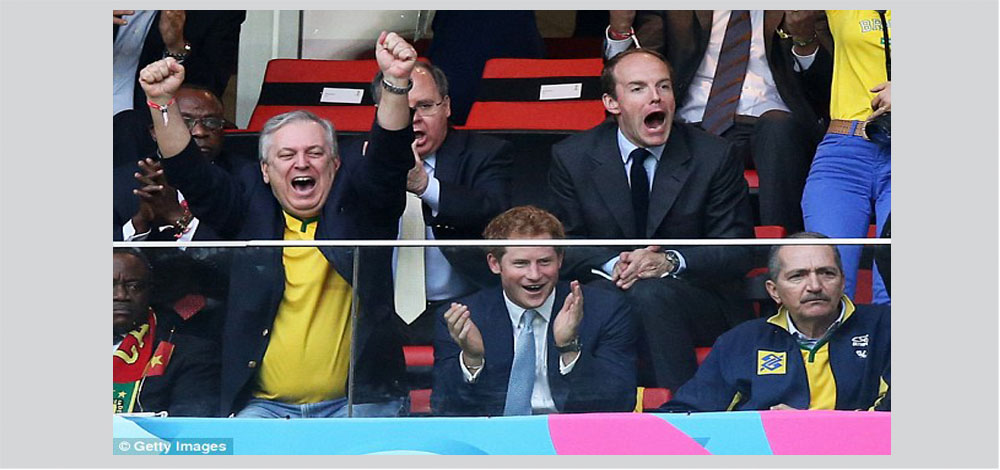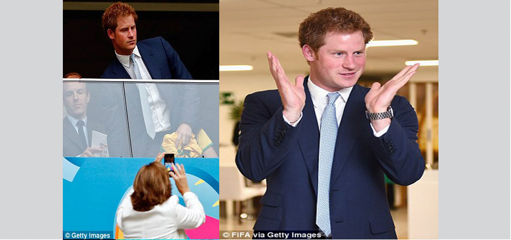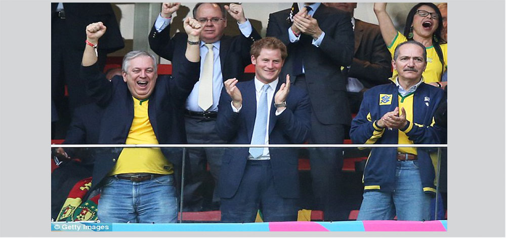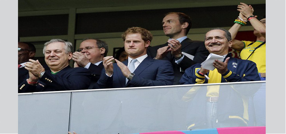 شوهد الأمير البريطاني،هاري، على مدرجات إستاد ماني جارينشا الوطني في البرازيل، وهو يحتفل مع المشجعينن بالفوز العريض الذي حققه المنتخب البرازيلي على نظيره الكاميروني، بنتيجة أربعة أهداف لهدف، ضمن مباريات الجولة الثالة من منافسات المجموعة الأولى.