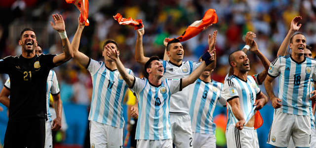 ميسي يحتفل مع لاعبي الأرجنتين بالتأهل إلى نصف النهائي. أ.ب