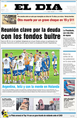 نشرت صحيفة «إل ديا الأرجنتينية» على غلافها صورة من تدريبات لاعبي منتخب بلادها، استعداداً لمواجهة هولندا غداً، في نصف نهائي المونديال، وقالت الصحيفة «الأرجنتين سعيدة وفي المزاج من أجل هولندا».