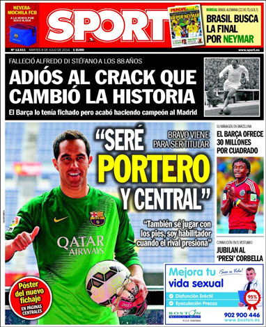 أفردت صحيفة «سبورت» الإسبانية مساحة كبيرة للحديث عن التقديم الرسمي للحارس الجديد لفريق برشلونة التشيلي برافو، الذي قال إنه جاهز لتحمل المسؤولية كاملة في الدفاع عن شباك الكاتالوني خلال الفترة المقبلة، كما ذكرت الصحيفة أن برشلونة عرض 30 مليون يورو من أجل التعاقد مع لاعب فيورنتينا الكولومبي غواردادو صاحب الإمكانات الفنية الكبيرة.