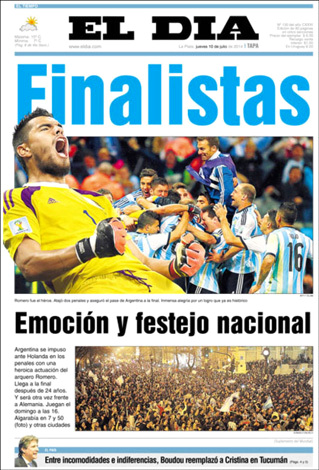 فجر التأهل الارجنتيني إلى نهائي المونديال احتفالات ارجنتينية كبرى في شوارع مدن الارجنتين بعد غياب طويل عن المباراة الختامية دام 24 سنة، وبالتحديد منذ نهائي 1990 حين خسر التانغو من المانيا في النهائي الايطالي المثير. وذكرت صحيفة «إل ديا» الارجنتينية إن مشاعر الفرح سيطرت على كل أرجنتيني بعد ان صد حارس الارجنتين روميرو ركلتي هولندا.