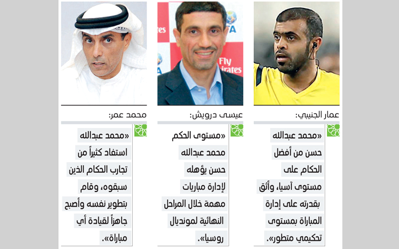 وأضاف عيسى درويش: «مستوى الحكم محمد عبدالله حسن يؤهله لإدارة مباريات مهمة خلال المراحل النهائية لمونديال روسيا، كونه يعد من أفضل الحكام في آسيا».