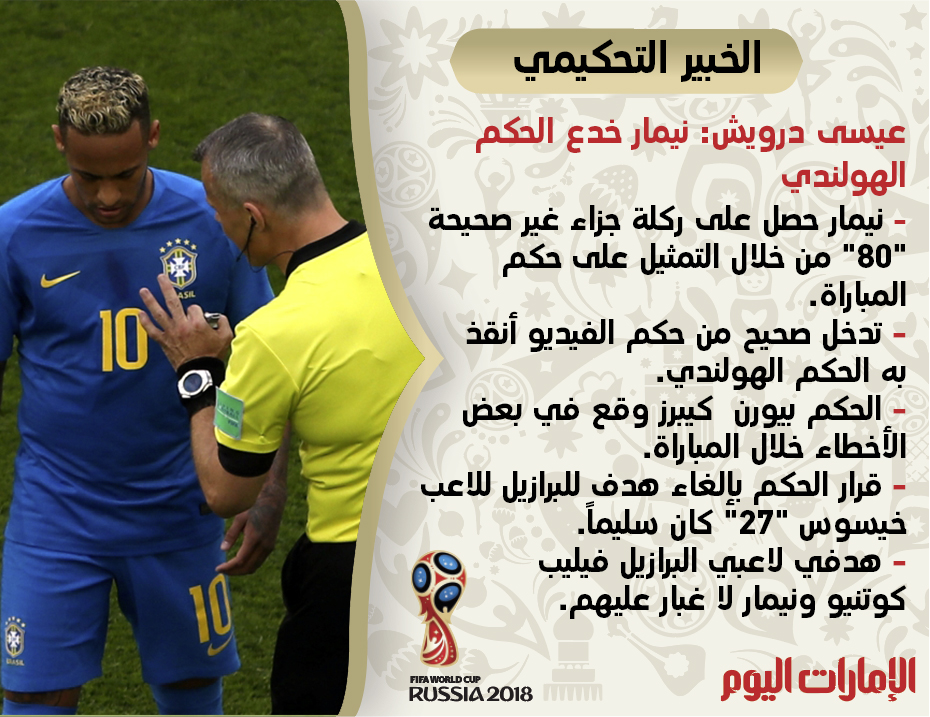 أكد خبير التحكيم في كرة القدم الحكم المونديالي السابق عيسى درويش أن مهاجم البرازيل نيمار داسيلفا خدع حكم مباراة فريقه أمام كوستاريكا التي أقيمت اليوم على ملعب كريستوفسكي بمدينة سان بطرسبرغ ضمن مباريات المجموعة الثالثة لكأس العالم في روسيا، وذلك عندما حصل منه على ركلة جزاء احتسبها لمصلحته " 80" قبل أن يتدخل الحكم الفيديو المساعد ويقوم بإلغائها بداعي التمثيل من قبل نيمار ، مشيرا الى أنه وعلى الرغم من أن الحكم الهولندي بيورن كيبرز الذي قاد المباراة يعد من أفضل الحكام في المونديال الا أنه وقع في بعض الأخطاء خلال المباراة التي انتهت بفوز البرازيل بهدفين دون رد وهو أول فوز لمنتخب السامبا في المونديال بعدما تعادل مع سويسرا بهدف لكل منهما في الجولة الأولى.