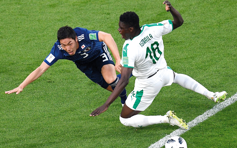 لاعب السنغال إسماعيل سار يقاتل لإيقاف الياباني جين شوجي. أ.ف.ب