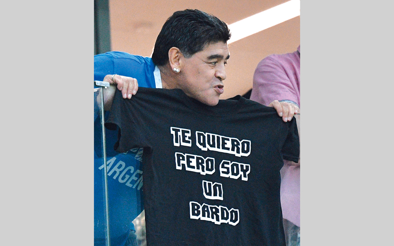 مارادونا يتابع المونديال ويحلل في برنامج «من يد رقم 10» الذي تبثه شبكة «تيليسور» التلفزيونية في فنزويلا. أ.ف.ب