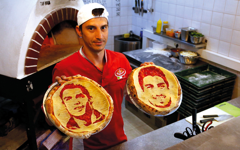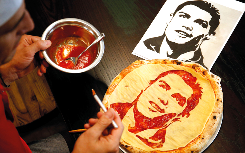 في سان بطرسبرغ بروسيا تفتق ذهن الطاهي فاليري ماكسيتشيك عن أسلوب مبتكر للاحتفال ببطولة كأس العالم لكرة القدم من خلال إعداد فطيرتا بيتزا تحملان وجهي النجمين كريستيانو رونالدو ولويس سواريز. وجمع الطاهي بين حبه لكرة القدم وفن صنع صور صالحة للأكل للاعبين اللذين تقابلا وجهاً لوجه، أمس، في دور الـ16 لبطولة كأس العالم. واستغرق صنع الفطيرة الواحدة نحو ساعتين لرسم كل وجه ليقدمهما الطاهي لرواد مطعم هوبهيد تاب رووم. ويقول ماكسيتشيك إنه يأمل أن يبرز فنه حبه للعبة كرة القدم، ووعد بأن يصنع فطائر بيتزا تحمل وجه كل لاعب من أعضاء المنتخب الوطني الروسي في حال فوز بلاده بكأس العالم لكرة القدم للعام الجاري.