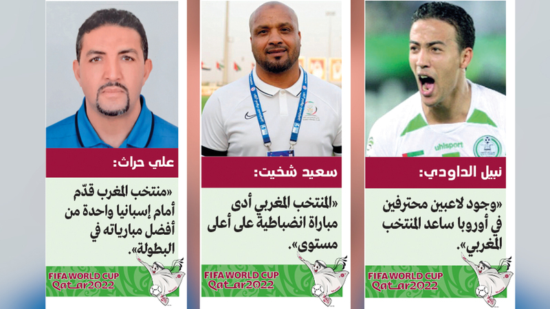 من جانبه، قال لاعب نادي الإمارات واتحاد كلباء السابق، المغربي نبيل الداودي، إن «هناك أكثر من سبب جعل (أسود الأطلس) يظهرون بهذا المستوى المميز، في مقدمتها وجود مجموعة من اللاعبين المحترفين في أكبر الأندية الأوروبية وظهورهم بشكل أساسي في فرقهم، الأمر الذي جعلهم لا يرهبون مثل هذه المواقف التي وضعوا فيها، والأمر الآخر والذي أراه أكثر إيجابية وأسهم في نجاح الأسود في مونديال قطر، هو وجود المدرب وليد الركراكي على رأس الطاقم الفني للمنتخب المغربي».