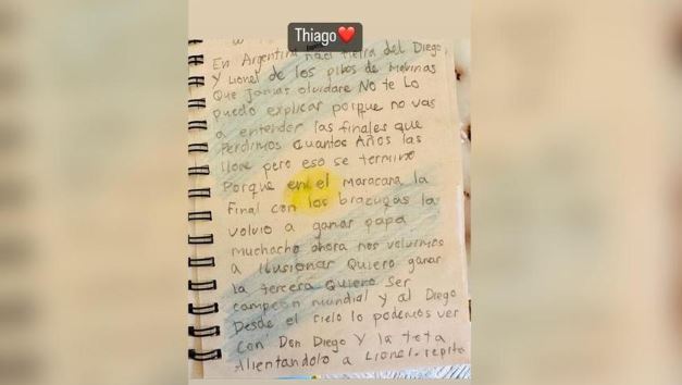 وختم: "أيها الأولاد، نحن الآن متحمسون مرة أخرى، أريد أن أفوز بالكأس الثالثة، أريد أن أكون بطل العالم، يمكننا أن نرى دييغو من السماء، معاً نشجع ليونيل".