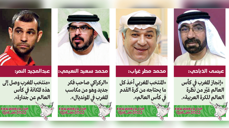 وأضاف غراب: «المنتخب المغربي وضع نفسه على المسار الصحيح، كون ما حققه يعد إعجازاً». ويرى نائب رئيس اللجنة الفنية بلجنة دوري المحترفين السابق محمد سعيد النعيمي، أن المنتخب المغربي يكفيه فخراً أنه جعل المنتخبات العالمية الكبيرة تنظر له باحترام.