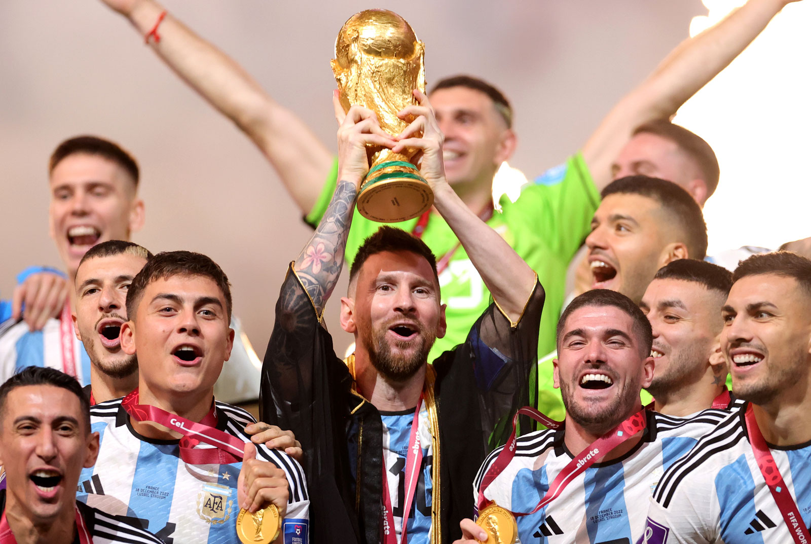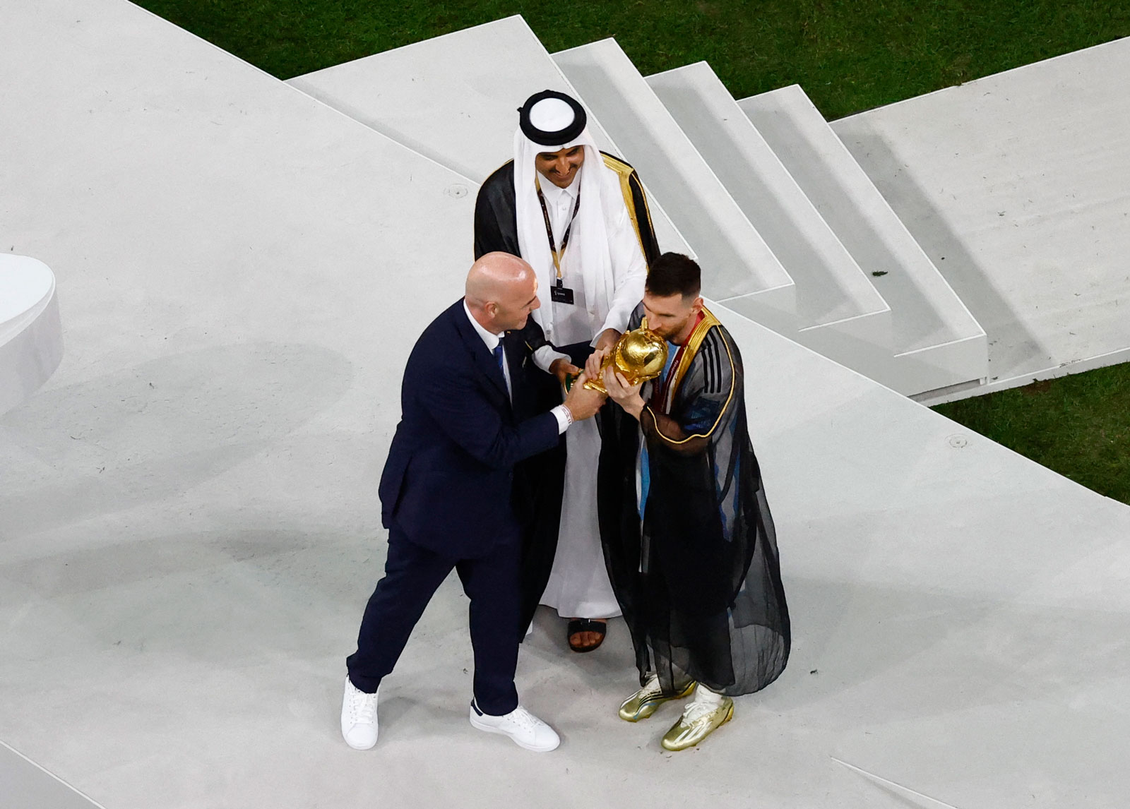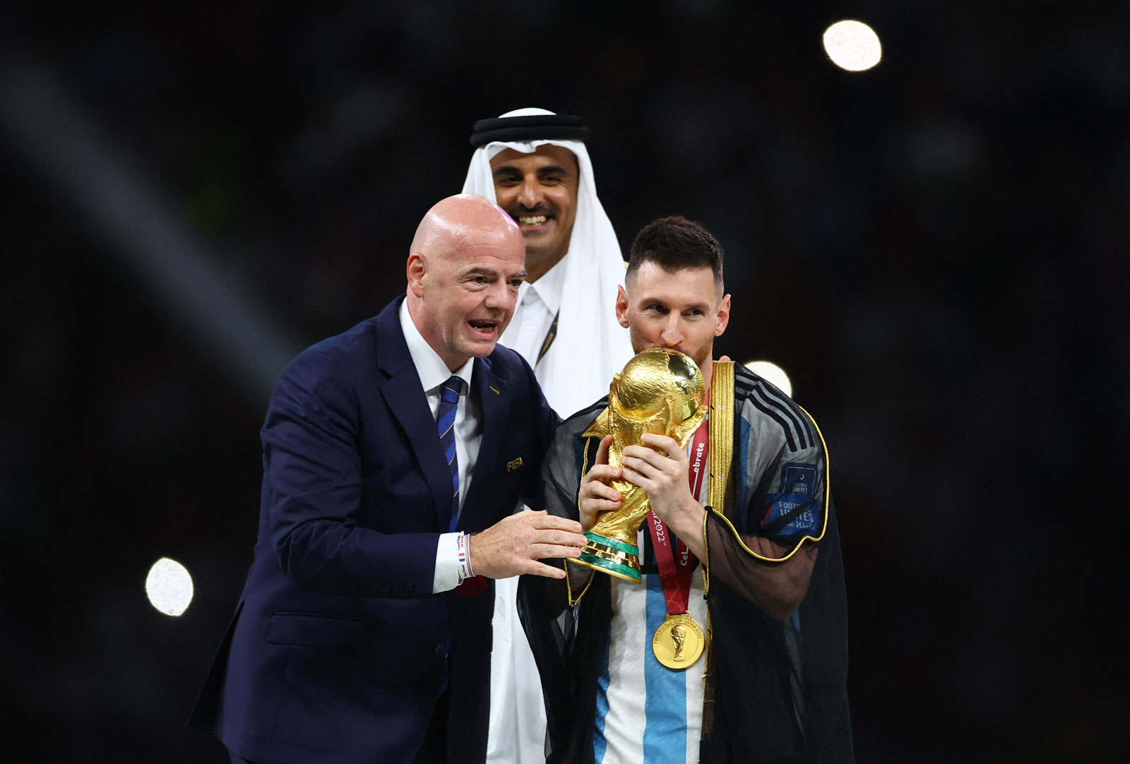 نشر الحساب الرسمي لمنتخب الأرجنتين لكرة القدم على موقع التواصل الاجتماعي "تويتر" صورة النجم ليونيل ميسي أثناء قيام أمير قطر تميم بن حمد آل ثاني، الذي أهداه عباءة سوداء (بشت)، ارتداها أثناء وقوفه على منصة التتويج واستلامه كأس العالم.