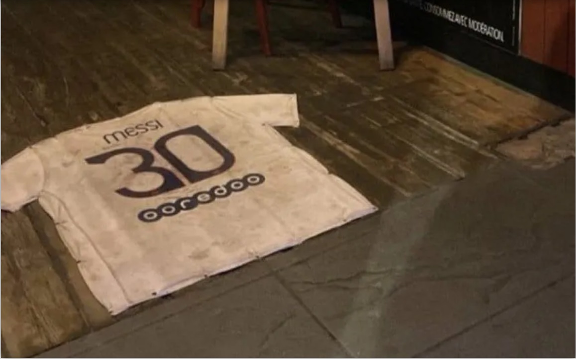وأوضحت أنه تم وضع قميص ميسي على الأرض، بجانب لافتة مكتوب عليها: "تذكر أن تنظف قدميك عند الدخول".
