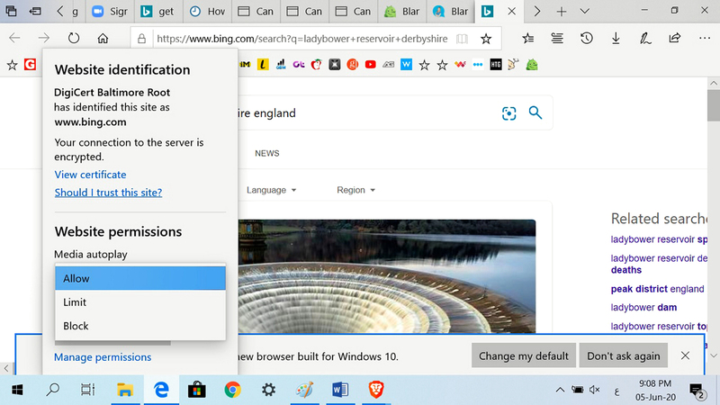 في تطويرها الدائم لمتصفح «إيدج»، الذي يعمل مع نظام التشغيل «ويندوز 10»، استجابت شركة «مايكروسوفت» لرغبة المستخدمين في التحكم في تشغيل الوسائط على المواقع المختلفة بحسب رغبة المستخدم، بحيث يستطيع التحكم في التشغيل التلقائي لهذه الوسائط. ويستطيع أيضاً تفعيل هذه الميزة لكل موقع على حدة. فإذا كنت من مستخدمي الإصدارات الحديثة من متصفح «إيدج»، فإن بمقدورك التحكم المسبق في صلاحيات وأذون التشغيل التلقائي لكل موقع «ويب» على حدة باتباع ما يلي: افتح المتصفح الذي تبدو الأيقونة الخاصة به في شكل حرف «e»، وتوجه إلى الموقع الذي ترغب في التحكم في تشغيل الوسائط به بشكل مسبق، ثم انقر فوق أيقونة معلومات الموقع التي تبدو في شكل قفل صغير في الجانب الأيسر من شريط العناوين أعلى الشاشة، ومن ثم مرر داخل النافذة المنسدلة حتى تصل إلى القسم الخاص بالصلاحيات الممنوحة للموقعWebsite permission وانقر فوق خيار «إعدادات التشغيل التلقائي للوسائط»Media Auto play Settings، وبعدها انقر فوق رأس القائمة المنسدلة المجاورة للخيار الافتراضي وهو السماح، لتلاحظ ظهور ثلاثة خيارات «السماح» Allow أو «الحظر» Block أو «السماح بدرجة معينة» Limit، وعندها انقر فوق ما تفضله منها.
