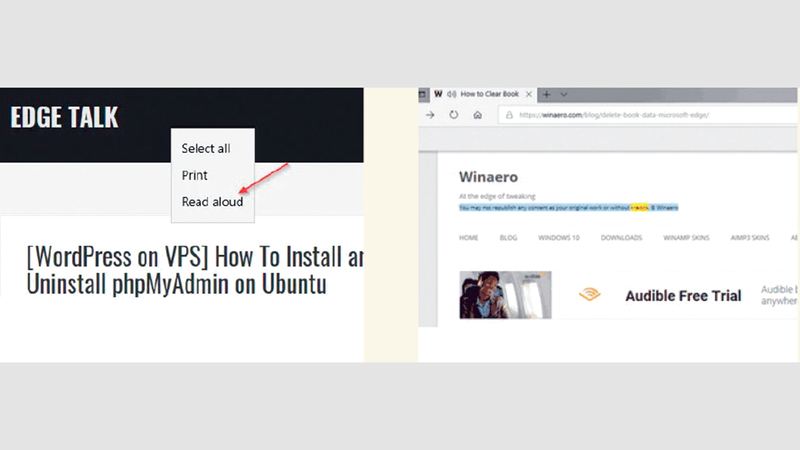 فإذا كنت من مستخدمي متصفح «إيدج» ورغبت في الوصول للوحة التحكم في ميزة قراءة المحتوى صوتياً، اتبع الآتي: انقر فوق صفحة الـ«ويب» التي تريد قراءة محتواها بزر الفأرة الأيمن، ثم انقر فوق خيار «القراءة بصوت مرتفع» Reading Aloud داخل النافذة المنسدلة، ليظهر أمامك أعلى الشاشة شريط أدوات جديد يضم مجموعة من الخيارات، وبعدها انقر فوق السهم الذي يشير جهة اليسار للعودة بالقراءة إلى جزء سابق، أو فوق أيقونة الخطين المتوازيين لإيقاف القراءة مؤقتاً، ومن ثم انقر فوق السهم الذي يشير إلى اليمين للتقدم في عملية القراءة عن الجزء الذي تستمع إليه، ثم انقر فوق أيقونة الشخص الموجودة يمين الشاشة لضبط إعدادات الصوت بحسب رغبتك، وبعد انتهاء القراءة، انقر فوق أيقونة «X» لإخفاء شريط أدوات القراءة الصوتية.